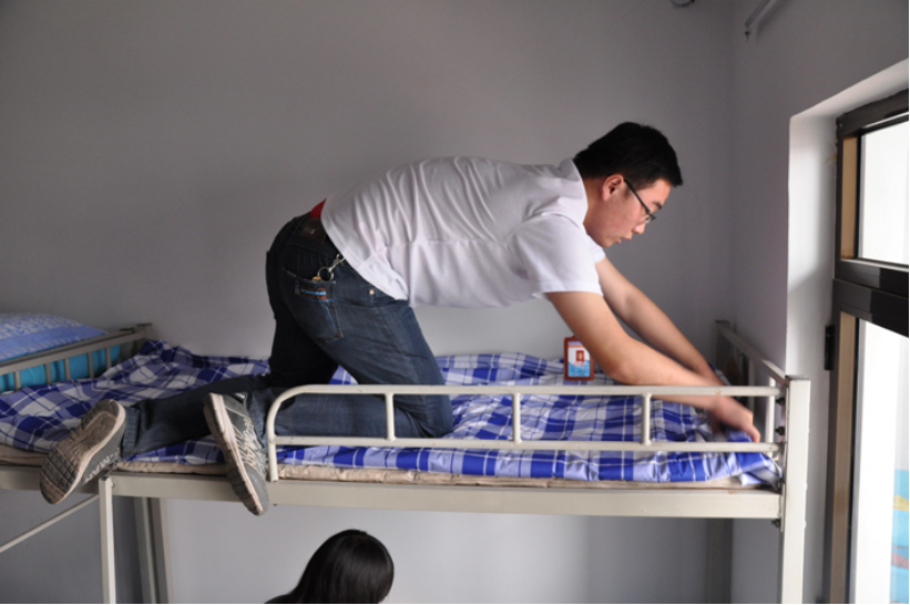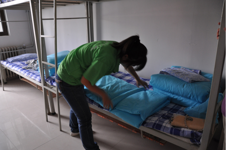 志愿者帮新生整理床铺