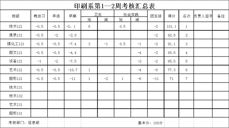 速录121班、印刷技术121班、设备121班上缴率100%各班分别加1分