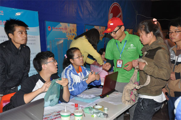 印刷出版系接待点的新生报到志愿者,从早上到晚上,他们忙碌了十几个小时。晚上9点多钟,一边统计着已报到的新生人数,一边说:“新同学快来齐了,但是还有部分没来校报到的同学,我们要继续加油,争取接待好他们。” 注册报道组的工作很简单,一个负责登记新生的姓名、专业和班级等信息资料,一个负责安排宿舍。“虽然程序很简单,但为新同学服务周到才是最重要的。” 注册报道组的组长说。