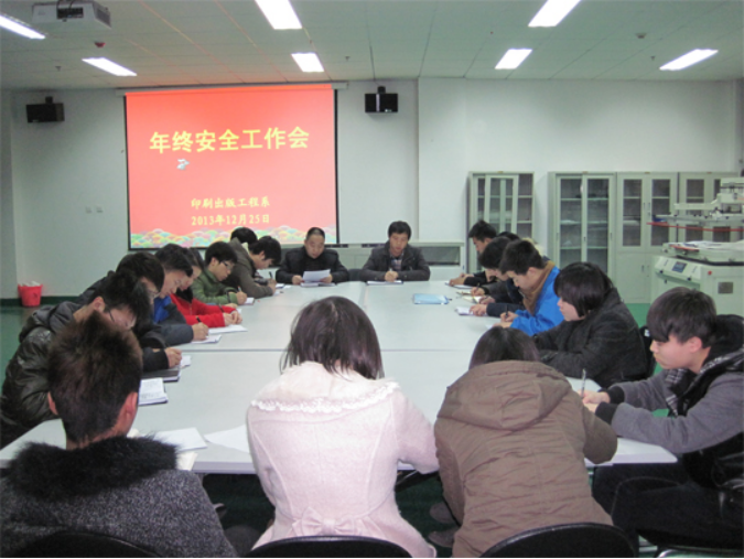 25日晚,印刷系在第三工业中心召开了年终安全工作会,系领导、辅导员、员工会干部及各班班长参加了会议。辅导员组织与会人员学习了公司《关于做好期末及寒假期间员工工作的通知》及《2013年年终安全检查及做好寒假安全工作的通知》精神,并宣布了系里落实文件要求的具体活动安排和措施。随后,系领导重点从校园安全、宿舍、人身、财物以及交通出行安全等方面做了强调,安排各班要以诚信考试、安全检查及假期工作安排为主要内容召开班会,传达院系的各项要求,向全系同学告知安全注意事项,并号召员工干部切实发挥模范带头作用,会议同时安排部署了假期员工作业和2014年员工工作计划的制定。会议结束后,系领导和员工干部对员工宿舍进行了逐一检查,结合检查进行了安全教育,讲解了防范措施,同时号召同学认真复习、积极备考、注重安全,并向所有的同学送上新年祝福。