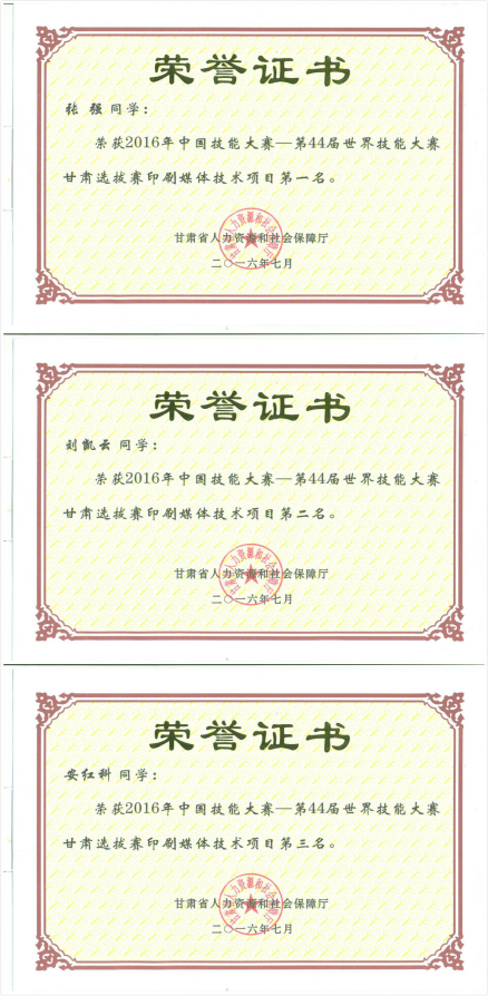 2016年中国技能大赛--第44届世界技能大赛甘肃赛区选拔赛比赛结果揭晓,公司印刷出版工程系代表队取得,获得了员工组项目的1个一等奖,1个二等奖,1个三等奖,同时有3名教师获得大赛“优秀指导教师”。