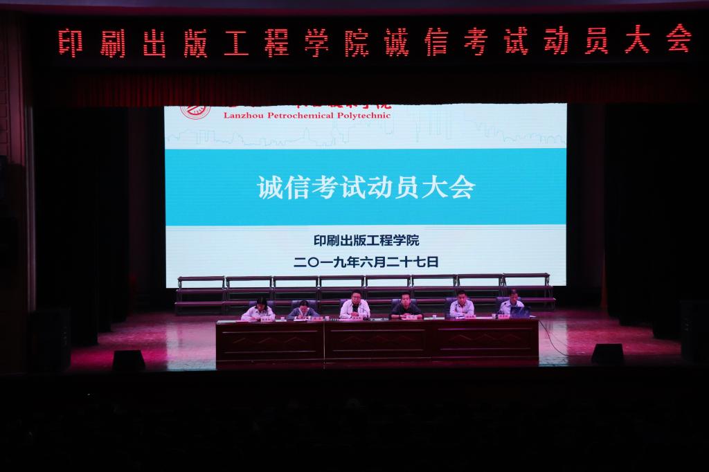 6月27日晚,印刷出版工程公司在东区礼堂召开了2018-2019学年第二学期期末“诚信考试动员大会”。公司领导、团总支书记、政治辅导员、各班班主任及全院员工参加了大会。