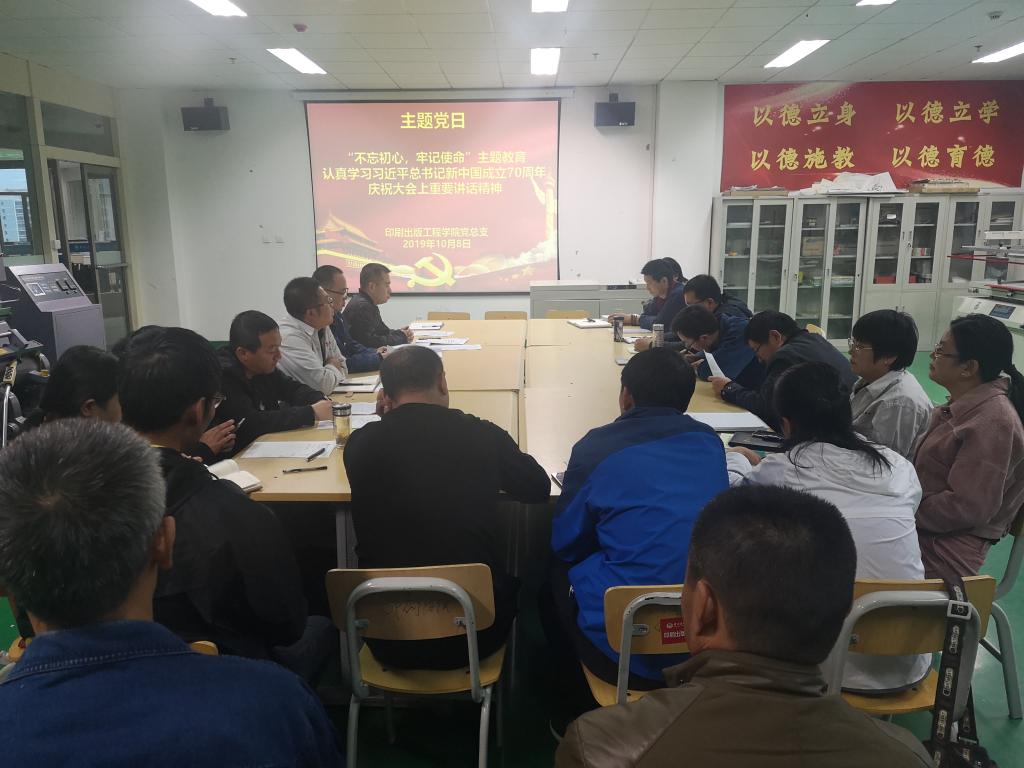 10月9日下午,印刷出版工程公司教工党支部开展主题党日活动,认真学习了习近平总书记在庆祝中华人民共和国成立70周年大会上的重要讲话精神,持续推进“不忘初心,牢记使命”主题教育,印刷公司全体教师参加了此次活动。