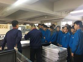 印刷公司为了让员工直观了解企业生产、知晓工艺流程,利用“校中厂”提前开展印刷生产型实训。印刷厂总经理为员工进行入厂安全教育,印刷厂车间主任为同学们讲解印刷复制工艺流程和员工安全操作规范,实训任课教师指导员工在观察中学习、在操作中训练、在总结中提升,把学到的理论知识运用到实践中。