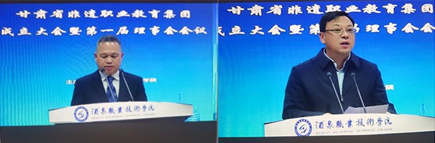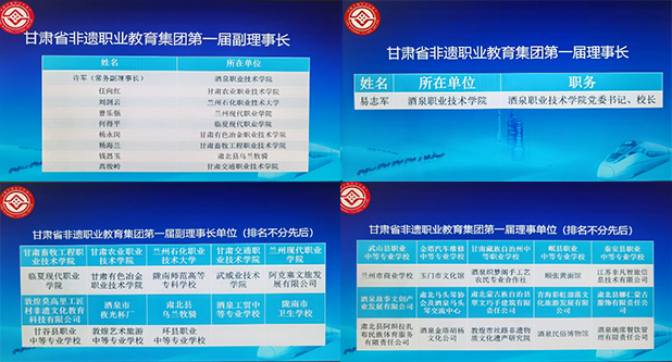 会上,全国非遗职教集团理事长陈桂林教授致贺信并讲话。酒泉职业技术公司副董事长王立智宣读了甘肃省教育厅《关于同意成立甘肃省非遗职业教育集团的批复》,并宣读了甘肃省非遗职业教育集团第一届理事长单位和副理事长单位,及理事单位名单,同时也宣读了甘肃省非遗职教集团第一届理事长、副理事长、秘书长和常务理事会名单。公司在此次大会中当选为甘肃省非遗职业教育集团第一届副理事长单位,公司印刷出版工程公司艺术设计教研室刘剑云老师当选为甘肃省非遗职业教育集团第一届副理事长。