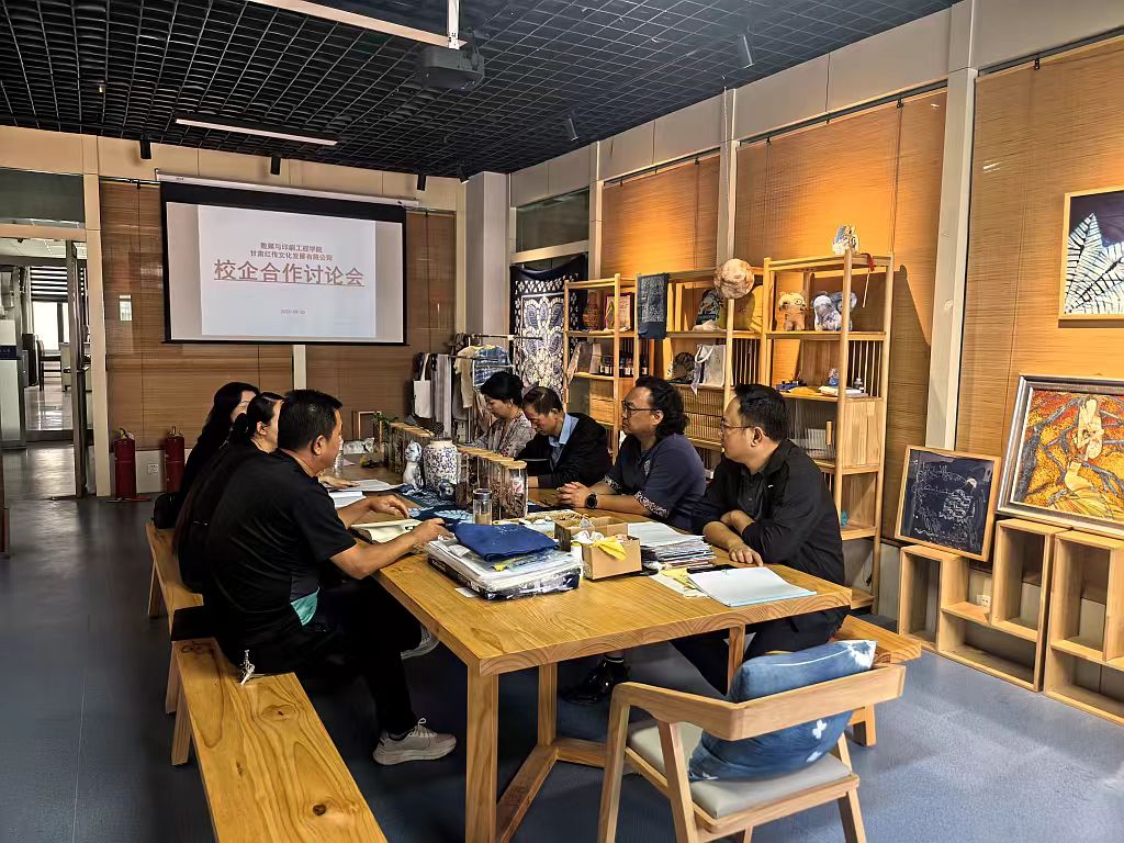 2025年9月5日上午,2026世界杯官网与校企合作签约企业甘肃红传文化发展有限公司在公司第三工业中心七楼非遗工作室开展了校企产教融合研讨会。甘肃红传文化发展有限公司总经理姚艳玲女士,公司党总支负责人,公司经理,艺术设计教研室主任及相关教师参加了本次会议。