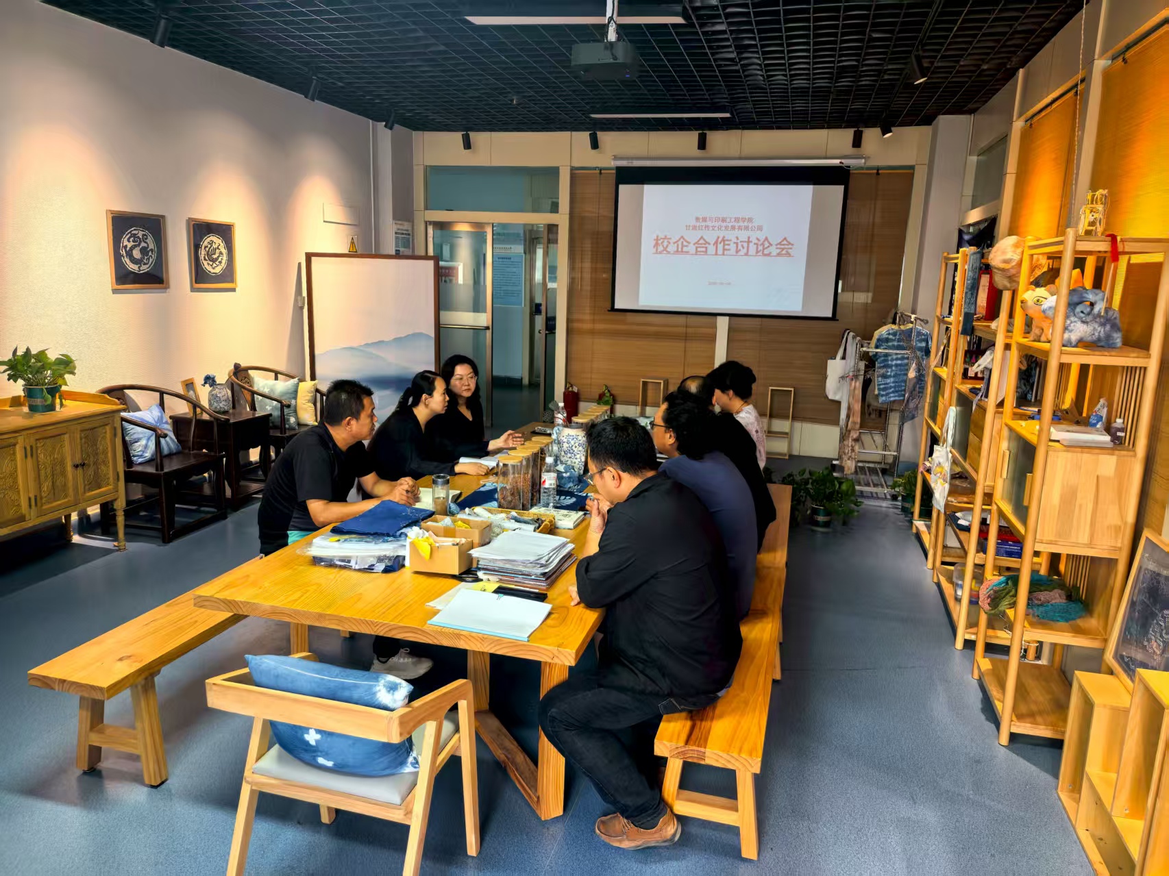 会上,公司经理对姚艳玲女士的到来表示热烈的欢迎。双方就集教学、研发、生产、展示于一体的开放式非遗文化传承与创新平台建设等问题展开热烈讨论。公司负责人就公司目前教学情况与员工职业发展情况进行了详细的说明,并就下一步教师团队人才梯队建设与非遗文化传承与创新平台建设提出合作设想。