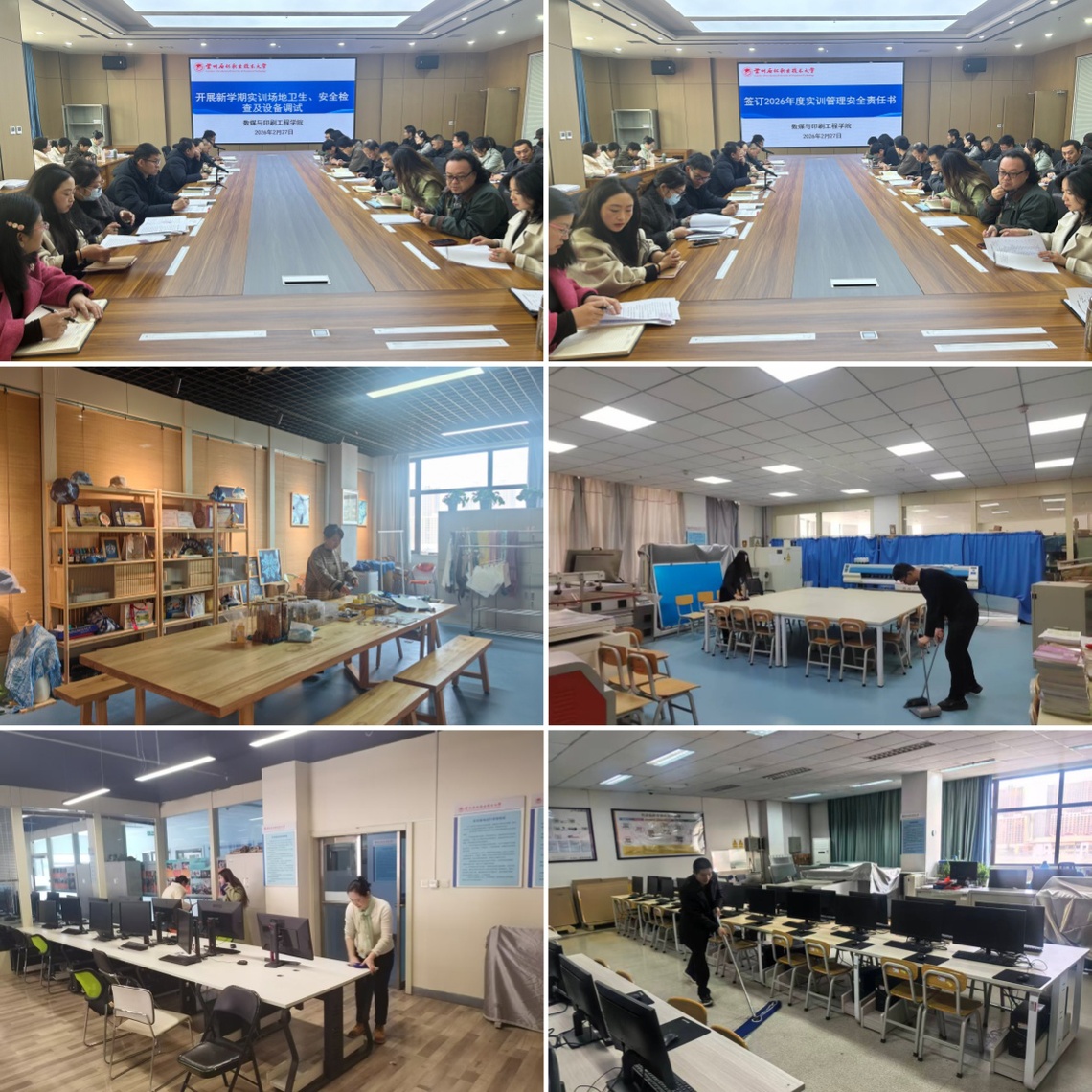 会后,印刷、数媒、艺术三个实训基地在教研室主任的安排分工下,对下设19间实训室卫生进行彻底清扫。并集中排查水电、门窗、消防及风险隐患点,调试设备投影,全面做好期初教学准备。
